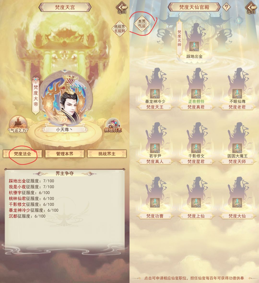 区里大佬打下界主后,有时会召开法会,必须在法会正式召开前讲入法会,如果在法会召开的界域担任星君/仙官或输入内场口令(大佬一般会在群里发)可以享2倍修速加成。