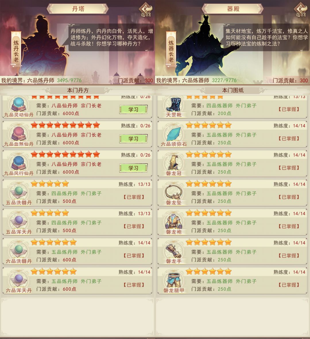 去仙宗前是可以把门派中1~6品攻防丹方和图纸学完的,尽量不要拖到仙宗去学。