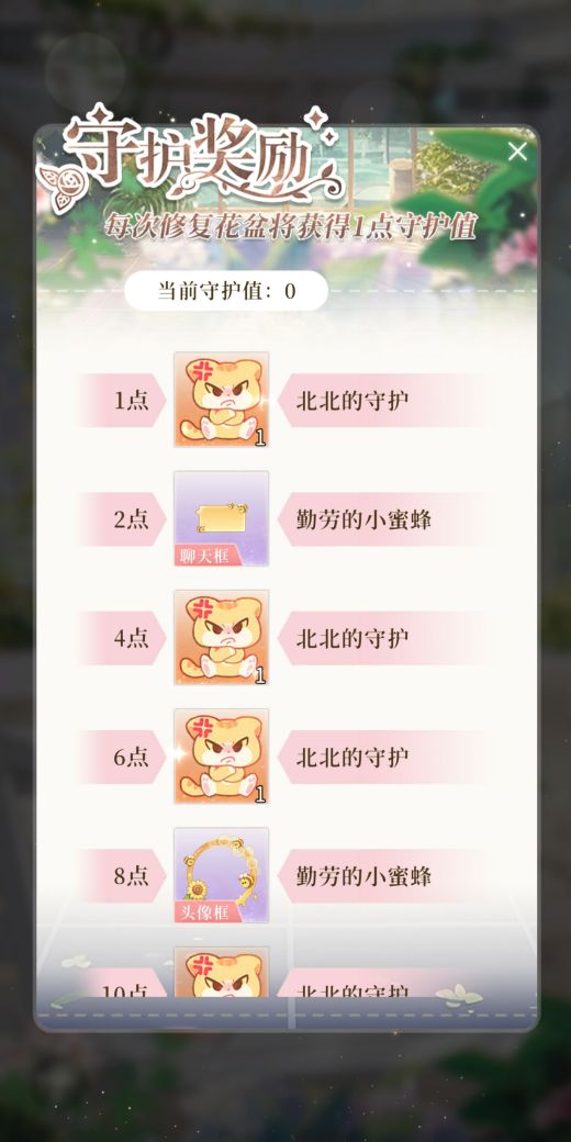 如果提前召唤了北北,北北就会守护你的花房~每次修复花盆还会积累守护值,解锁守护奖励!