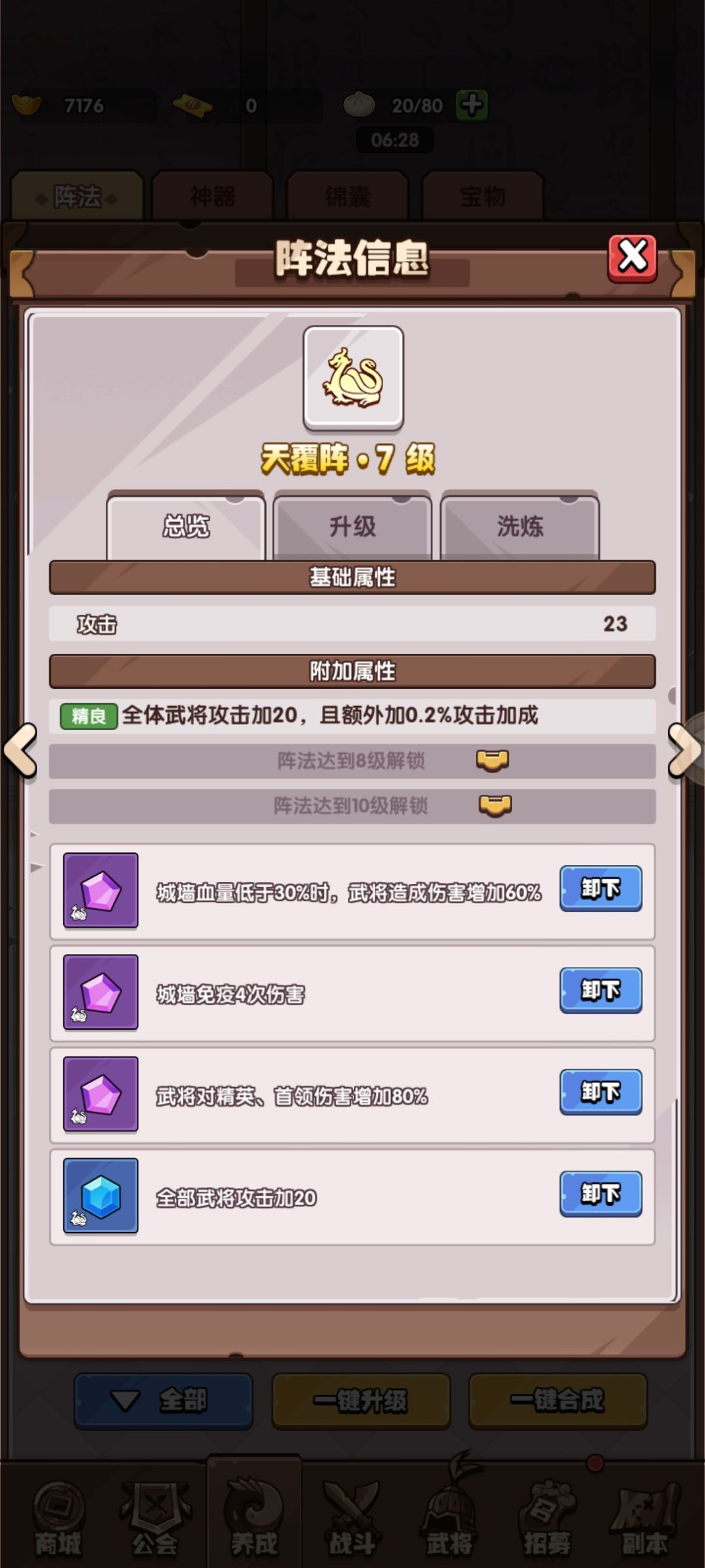 这套阵容输出靠大都督和双弓,辅助鲁肃(5级伤害也高还有控制)+貂蝉。一定要带上血量低于30%加伤害和加城墙血量的石头,开局有双弓和周瑜先上辅助后面上,没必要上六人口(多上一个人口不如加等级伤害高),前期肯定是要卖血的用来触发魂石效果,目前我的城墙1680血,500血以下就能触发了(我这质量本来也打不过会堆兵)所以能不能锁住血是关键(看发牌员给不给面子)主C武将优先拉等级。一般触发后主C等级够的话基本能稳血了(好几关都是20、30血才稳住,这个靠运气,没稳住可以多试几次)。