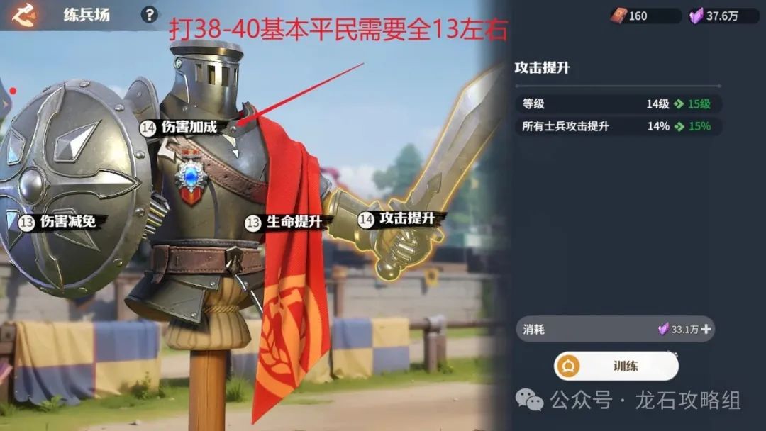 英雄这里还是跟是上期没什么变化。这里有2个最重要的点,除队伍人口基本5队40拉满外。大部分平民打不过是因为练兵场的士兵训练+兵种升阶没点满(硬性配置)。