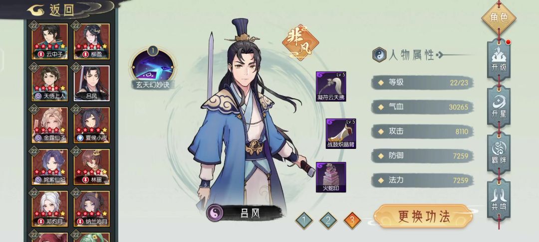 第六回合:云中子打出百转叠浪诀,吕风复制百转叠浪诀,天悟上人打出三清化水符,云中子打出三清化水符,天悟上人打出五行化水咒和断水龙威,吕风打出复制的百转叠浪诀,柳盈打出玄冰神破和玄冰九变,接着就可以输出了。注意我们要交替攻击,吃到威能加成。