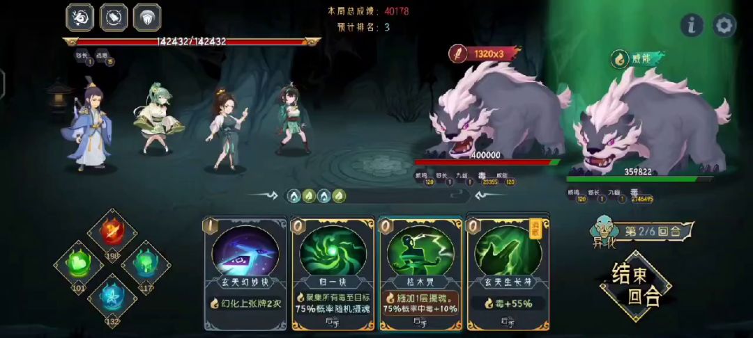 第三到六回合:如果有追风咒优先打出追风咒,宫莲华打出枯木咒和裂木决和千藤落樱斩斩死一只野猪,吕风复制千藤落樱斩,楚青青打出归一决,送的归一决如果在手也打出,吕风打出千藤落樱斩,斩死第二只野猪和新一轮的带毒的野猪,重复至结束。