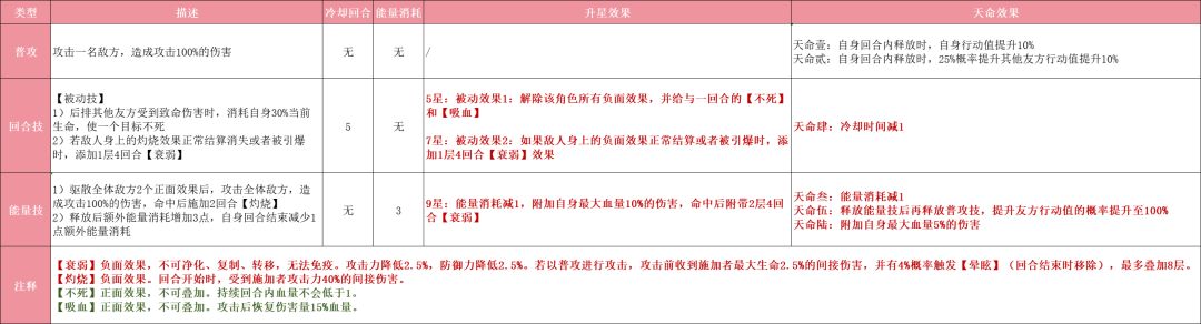 1)旱魃的普攻技可自拉条,概率给队友群体拉条,释放能量技后必定给队友群体拉条;回合技保护后排队友1回合不死,同时有条件附加衰弱负面状态;能量技群体附加灼烧和衰弱(9星)的负面状态