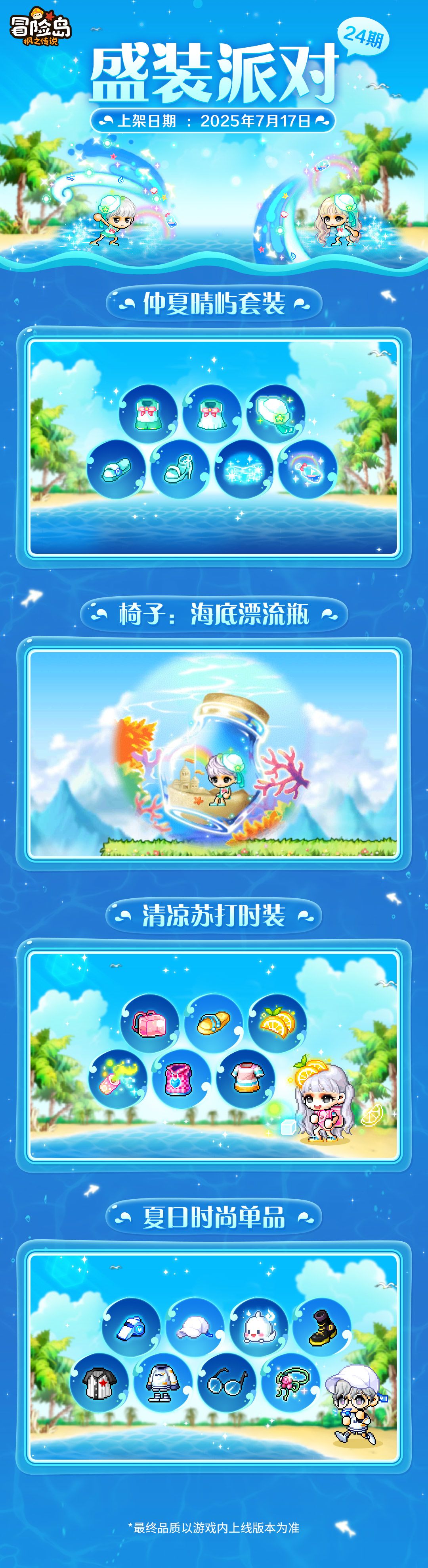 本期盛装派对商店上新「仲夏晴屿套装」及多款夏日海岛风外观单品,清凉短袖、海滩拖鞋、阳光棒球帽......每一件都是夏天标配~