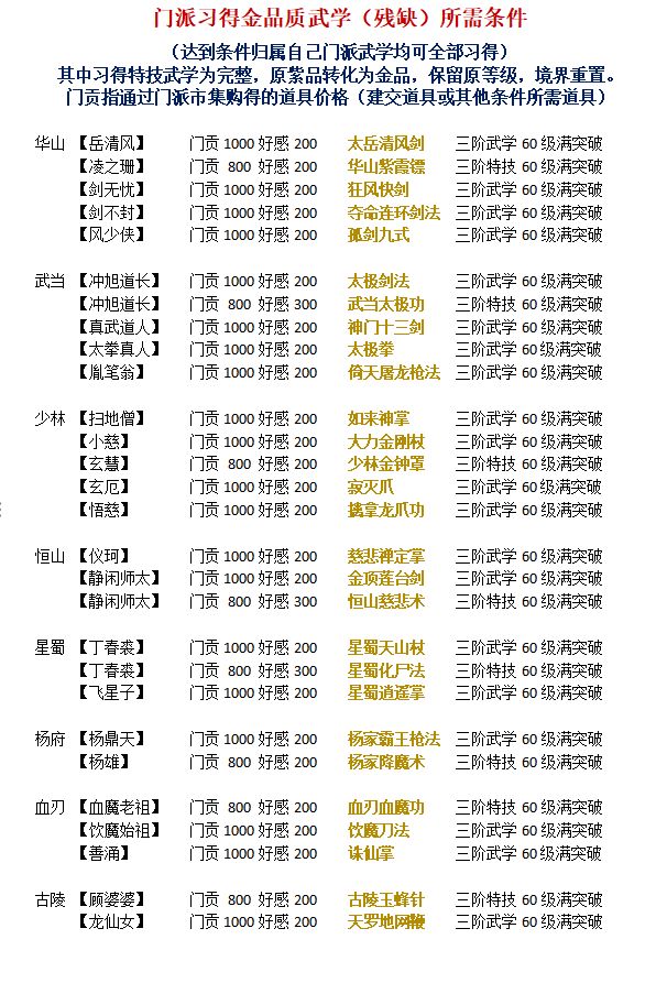 感谢群里大佬们提供图片。这里是门派已开的最高武功4阶,具体学习条件,效果,好感道具都有图。手动收集制作也有来源。具体自己看图。