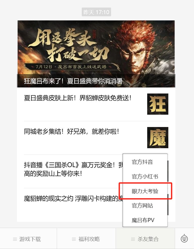 入口一:打开微信服务号“三国杀”,点击右下角菜单“杀友jihe”-“眼力大考验”,即可进入游戏界面。
