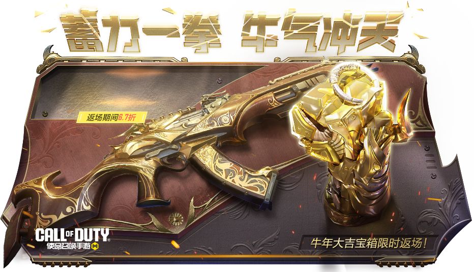 历经百战的AK47-牛年大吉正式回归,它身披暗金色盔甲,镶嵌金色特质花纹,枪身上的金牛早已做好战斗准备。拳套-牛气冲天裹挟着激昂的战意降临此地,拳套上悬挂着一只怒目圆睁的金牛,亟待冲破封印。