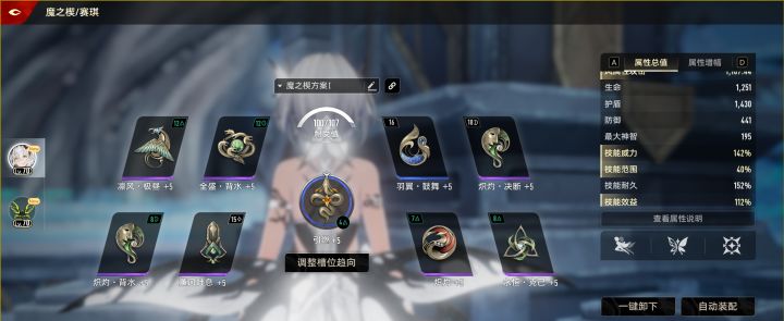 由于不吃技能范围,所以可以放心大胆拉技能持续(1命以上赛琪不需要拉持续),持续的作用是减少血量用完后的蓝量持续消耗,低级图割草可以使用第二套配卡,把进击换成羽翼鼓舞