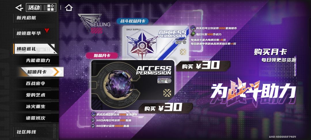 推荐战斗月卡,每天给体力和副本奖励次数+1