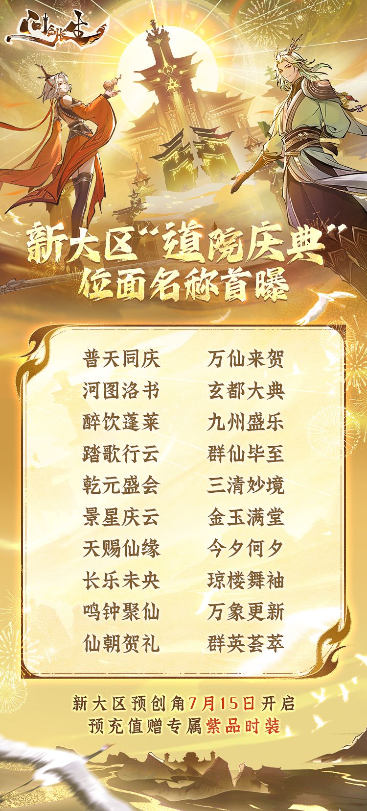 7月18日【仙友重逢】活动开启,邀请回流仙长填写召回码,双方立即可领取价值888元的奖励!(账号下所有角色超过15天,且账号有至少一名角色流失达到元婴前期,则该账号视为回流玩家,账号下的角色可填写召回码。)