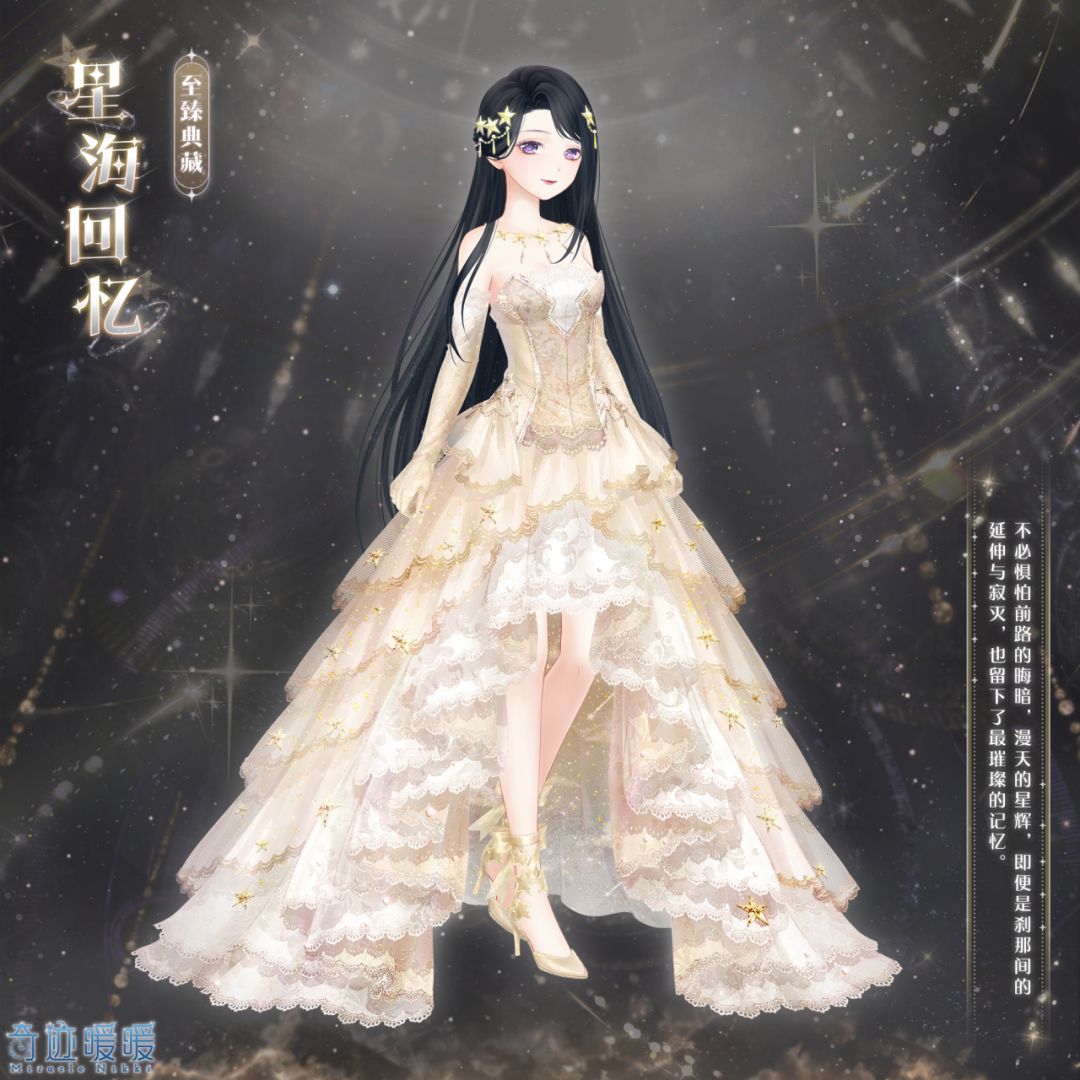 【星海誓约】发型“永夜舞星”、连衣裙“星海誓约”、鞋子“未央之舞”、头饰“华粲星芒”、手套“幽渺星光”均含精美特效。