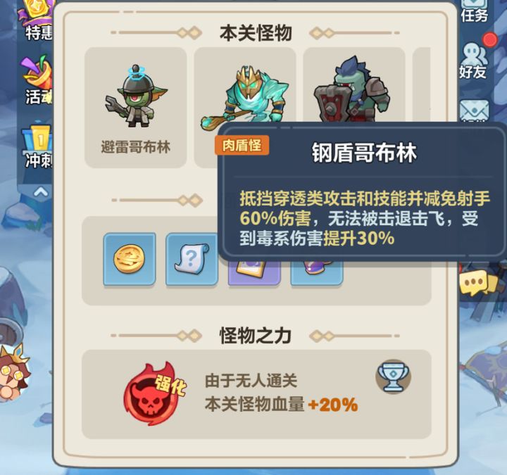 首先这个图腾能刷出的部位包括皇冠,号角,铠甲,鞋子,戒指,项链所有的6件装备,也就是如果每个部位都带一个橙色级的肉盾增伤最高可以达到192%对肉盾增伤。很多新手会问那么哪些怪属于肉盾,怎么看呢。在每一个主线关卡的主界面点开都可以看到本关的怪物种类。先说结论目前已知的包括主线,合作,城墙,公会boss,竞技场等主要模式中,肉盾怪物的占比超过了50%,也就是你只要带这个通用伤害图腾他一定有用得上的怪物也是目前通用性伤害图腾中适用场景最多的,因此对肉盾增伤在目前6个装备的图腾位中除非有特别好的选择你实在没有他的位置,那么对于普通玩家来说,带上6个肉盾增伤的图腾是一个非常稳妥且下限非常高的选择。我给予他的评级是“A”,也就是他作为一个只要你有就可以常驻的图腾的坑位是完全没有任何问题的,也是新手洗练图腾最不容易出错的属性。非常建议刚入门的玩家在每个装备中都有一个对肉盾增伤的我图腾,包括紫色 蓝色都可以。