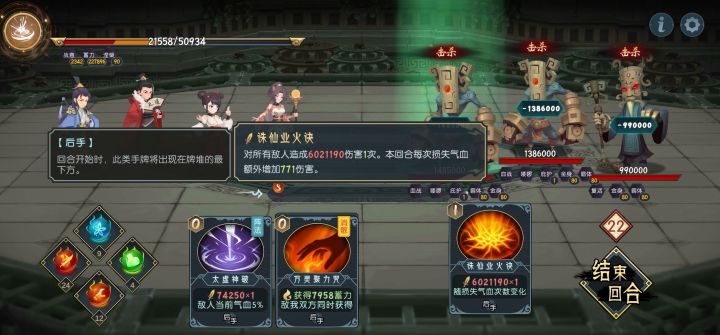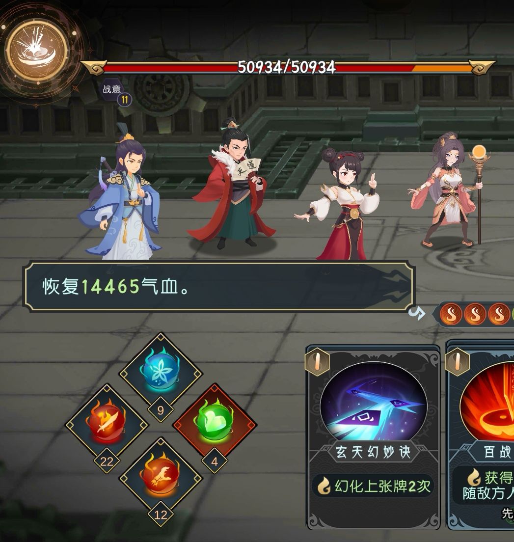 有九转重生术就复制重生,其他回合复制焚元蓄力决叠加蓄力,燃血扣血完了之后再嗑生元丹(感觉血量非常安全的回合也可以嗑战意丹,如果感觉血量不稳,就复制战意牌嗑生元丹不要再燃血)