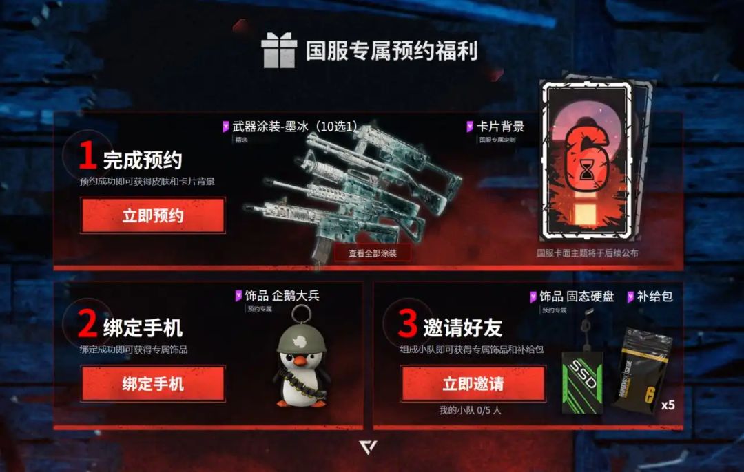 由腾讯代理的《彩虹六号》国服已经开启预约,完成预约的玩家可获得国服定制卡背、墨冰枪皮(十选三)以及专属饰品等奖励,预约网址: