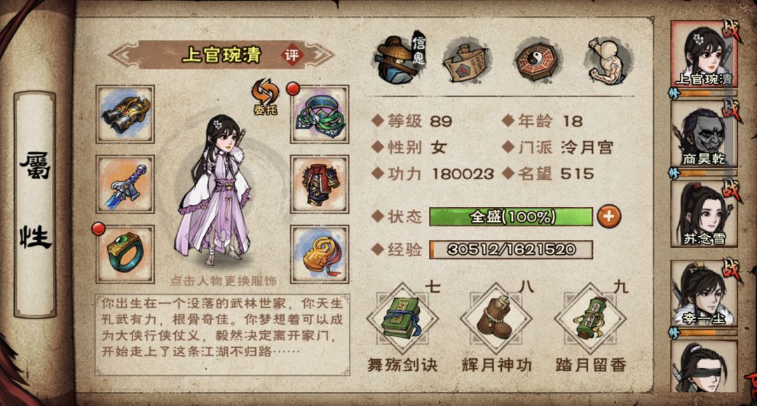 以下就是主力队,除了狂寒苏,基本都是在镇派阶段了。别问我小李子内功怎么还是种玉,我离火决前几天才解锁十重。主要是有时会忘记送酒。