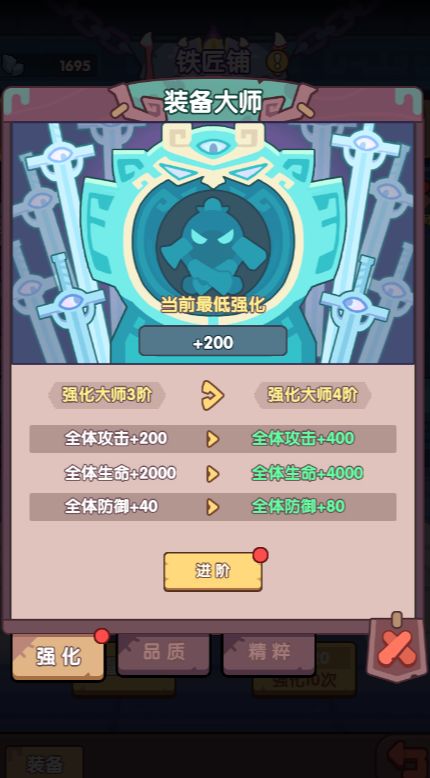 3、装备精粹大师:金色品质装备可进行精粹,精粹星级最低的装备达成要求,可激活或升级精粹大师,获得属性加成。
