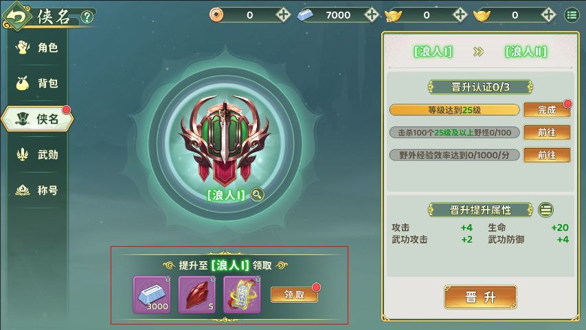 侠名每次晋升后,均可立即领取一份一次性的丰厚奖励。