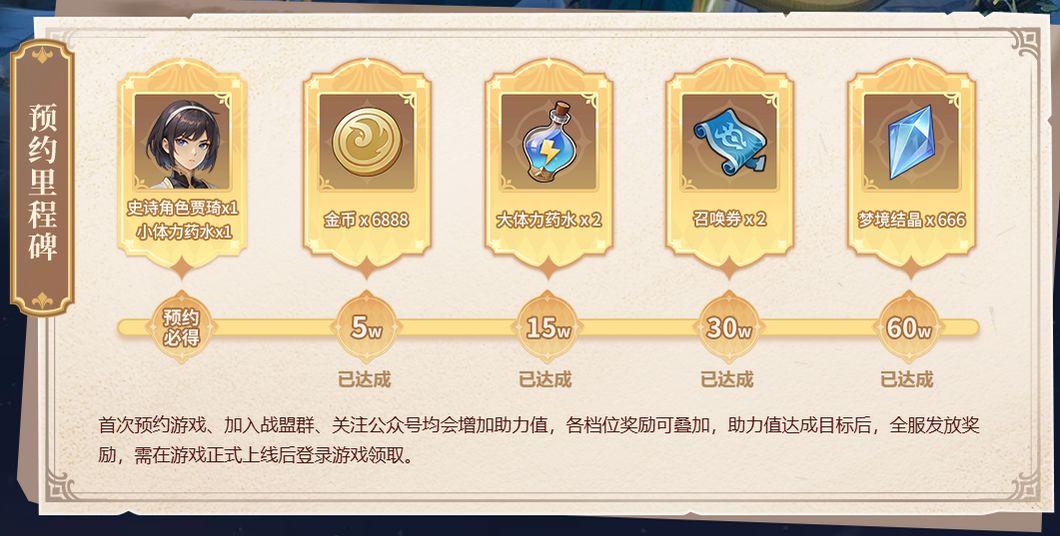 官网预约里程碑60万助力值达成,为回馈广大冒险者对游戏的热情支持,《狭道英雄》正式上线后,全服发放预约奖励,包括史诗角色贾琦、体力药水、金币x6888、召唤券x2、梦境结晶x666。