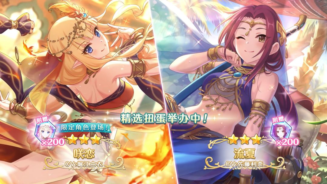 7月15日维护后,期间限定角色★3「咲恋(沙漠)」(CV:堀江由衣)、新角色★3「流夏(沙漠)」(CV:佐藤利奈)将正式登场并作为「精选候补角色」出现!