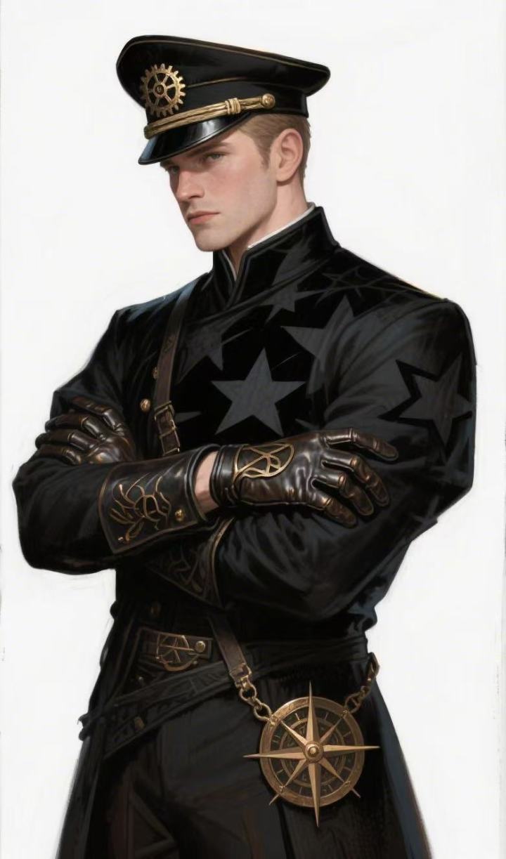 外观设定:身着改良版墨色深衣,衣料中织入星纹暗线,在光线下会流转出淡淡的蓝光。腰间悬着一枚青铜罗盘状配饰,实则是微型星图导航仪。头戴的方形小帽边缘嵌有金属齿轮,帽檐下露出一双锐利的眼睛,瞳孔中似乎有精密的齿轮在转动。双手戴着半指皮质手套,指尖露出的部分隐约可见金属质感的纹路,那是与战舰控制系统相连的神经接口。