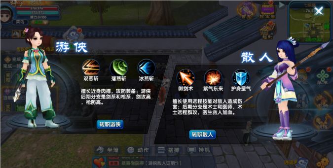 角色成长自由路线,专属技能战八荒:游戏内分别是两大职业阵营供你选择,第一种是游侠,职业细分为剑客/枪豪,第二种是散人,职业细分为术士/医师。两大阵营中,游侠是近战职业,散人则是远程职业。