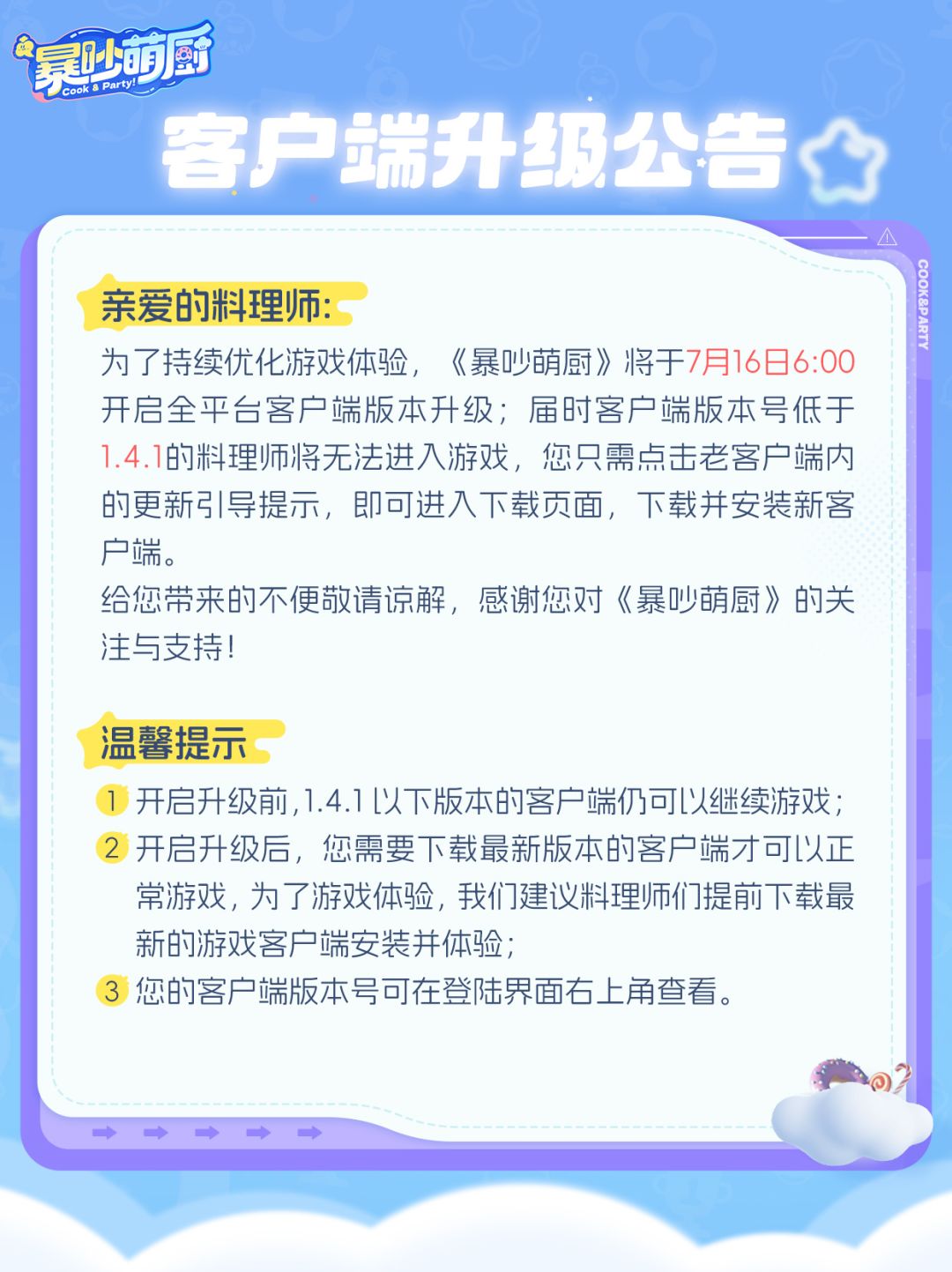 为了持续优化游戏体验,《暴吵萌厨》将于7月16日6:00开启全平台客户端版本升级;届时客户端版本号低于1.4.1的料理师将无法进入游戏,您只需点击老客户端内的更新引导提示,即可进入下载页面,下载并安装新客户端。