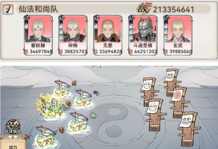 三阶花禅速度尽可能低,最好是全队最后一个出手,燃灵禅速度与可以快一点,且需要至少洗出橙色燃灵变异,石僧、燃灵禅、花禅是核心不可替换,地藏禅可以换紫灵,玄岩禅可换萧辰。