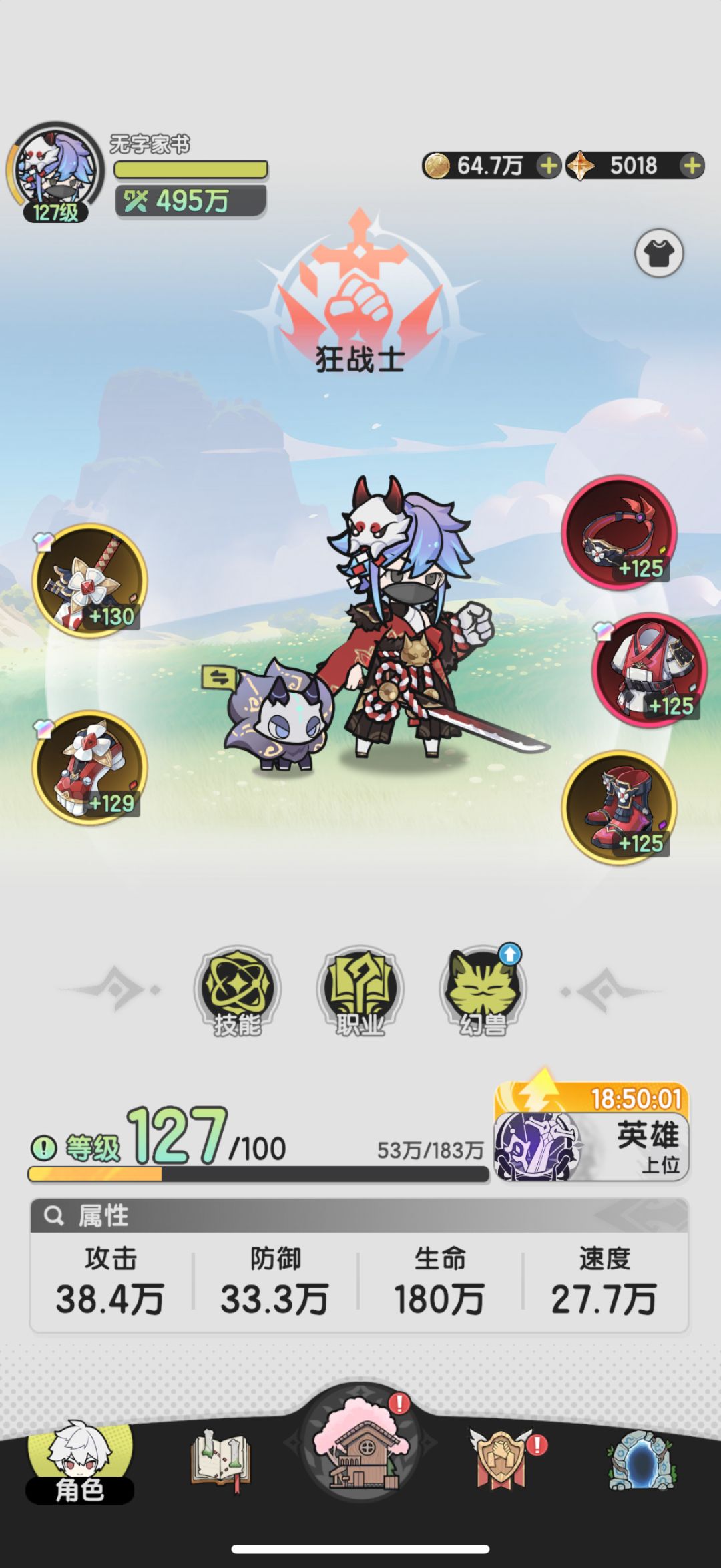 战力:495w,职业等级128,人物等级127;