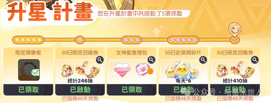 先用在新神话角色上线的两周内,达到指定练度会解锁对应奖励,标有“50日”字眼的档位奖励会分50天进行资源发放。给的资源是非常可观的,对于大多数玩家来说,这些资源都很有分量。