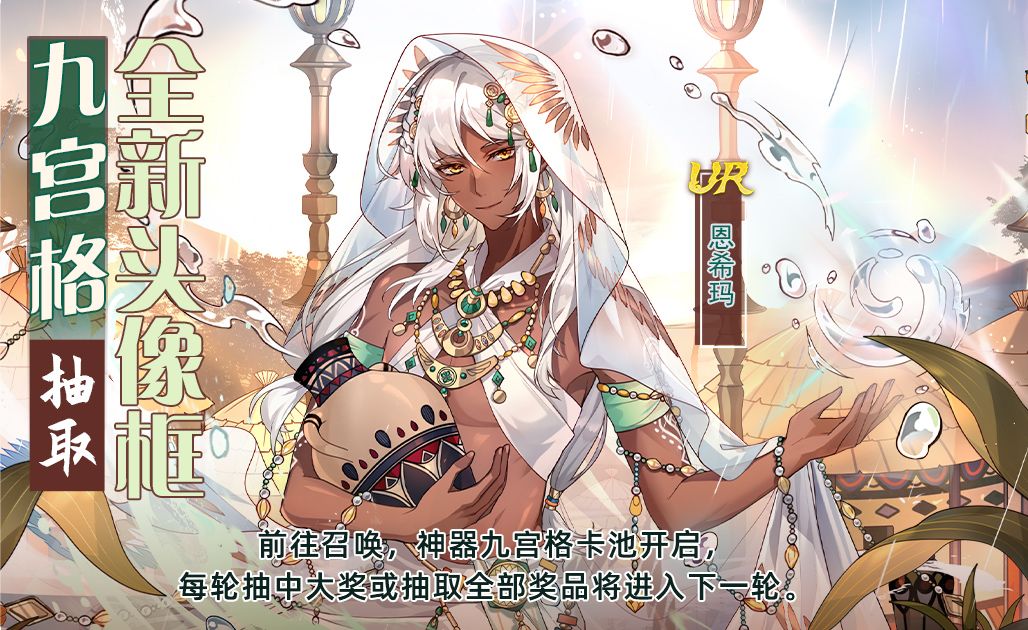 活动描述:活动期间,御侍大人使用专属道具可抽取游戏内UR飨灵-恩希玛神器相关豪华道具和超稀有头像。
