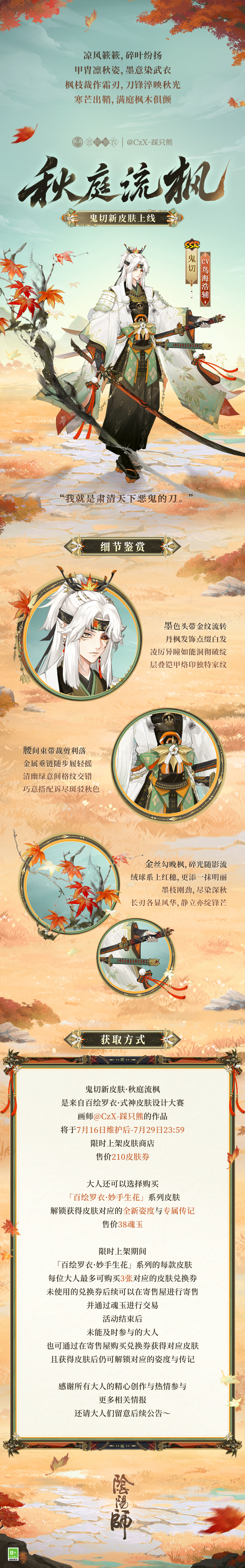百绘罗衣系列新皮肤「鬼切·秋庭流枫」即将上线,皮肤细节鉴赏为大人奉上!该皮肤将于7月16日维护后-7月29日23:59限时上架皮肤商店,售价210皮肤券。大人还可选择购买「百绘罗衣·妙手生花」系列皮肤,解锁获得皮肤对应的全新姿度与专属传记,售价38魂玉。