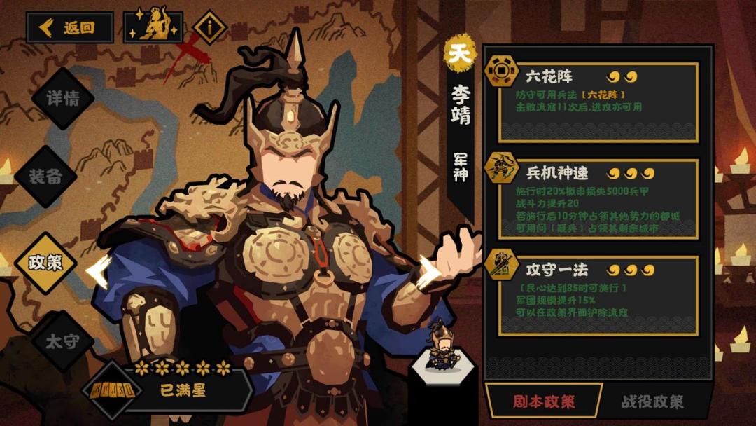 首先是大唐军神李靖,每个政策都很有说法。先看三政策【攻守一法】,可以把地图上的流寇全都关进塔里统一征讨。光游戏体验就能提升不少,以后造建筑归造建筑,打流寇归打流寇,互不干扰。至于塔里的流寇估计是能一次清完,只要你实力够,这样就能配合一政策,以及其他需要打流寇的名臣。而【六花阵】强度就得看友军攻防到底加多少了,实战当中可以让跑的慢的枪兵,或者中了减速性格的武将去罚站招骑兵。二政策【兵机神速】我之前就预测过类似技能,只是弱了好多,又有时间限制,又要用间,20%损失兵甲这个倒是可以忽略。没理解错的话,打下首都之后,其他城市需要一个个用间占领,成功率还得受用间等级影响,说不定还没直接打快。不过大唐毕竟是他主场,既然有这技能,应该会有用武之地。