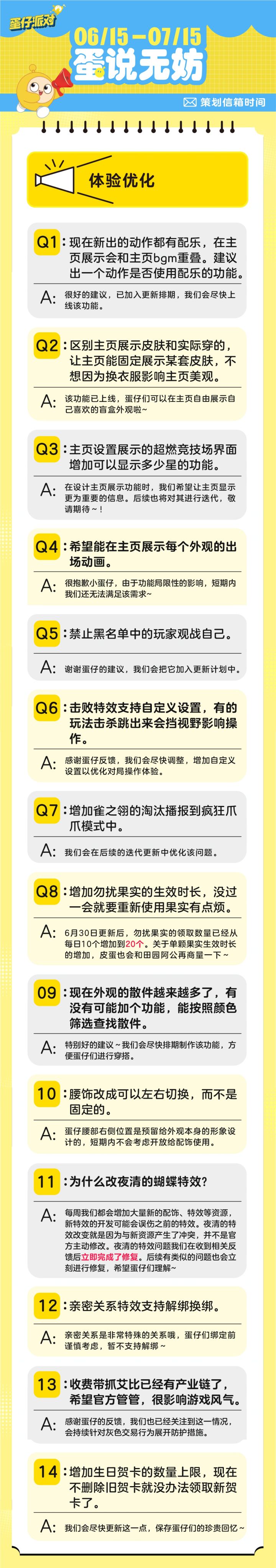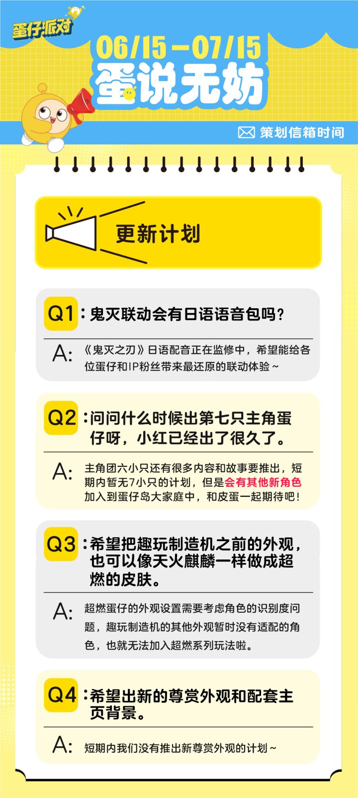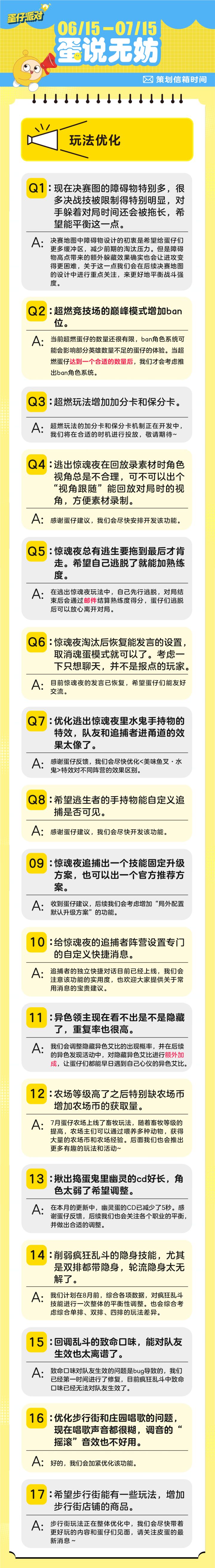 娱乐玩法平衡性调整规划、主页展示功能更新、鬼灭联动最新动向......准时为蛋仔们奉上7月策划Q&A!速戳下图,解锁本月蛋仔岛的前沿动态。