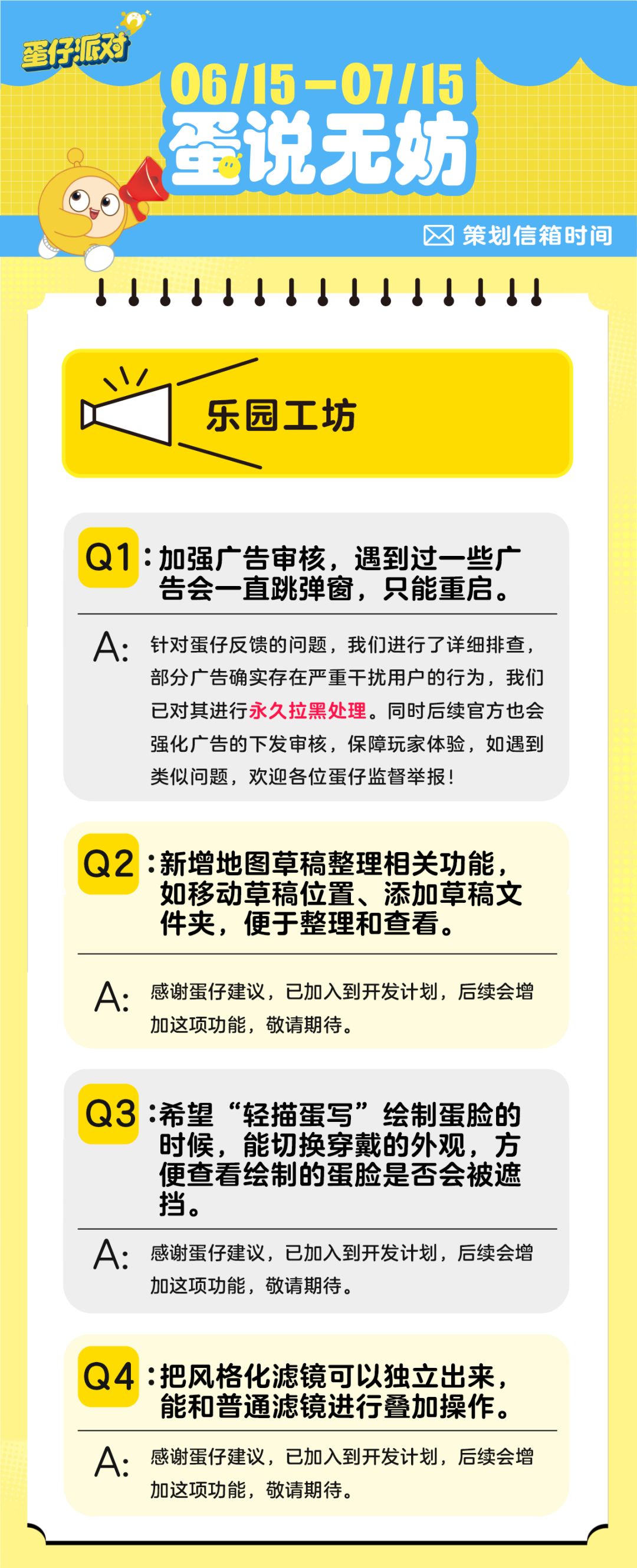 蛋仔们最关心的情报,尽在每月《蛋说无妨》!每月15日,皮蛋都会收集大家的建议和疑问,并带回策划的回信。蛋仔岛怎么玩更畅快?快在评论区留下你的好点子吧~