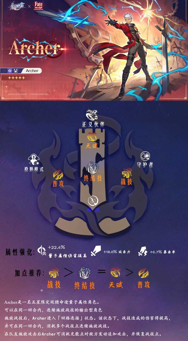 Archer是量子属性-巡猎命途五星角色,可以在同一回合内,连续施放战技的输出型角色施放战技后,Archer进入「回路连接」状态。该状态下,战技造成的伤害将提高并可在同一回合内,消耗多个战技点连续施放战技。在队友施放攻击后Archer可消耗充能点对敌方发动追加攻击,并恢复战技点。