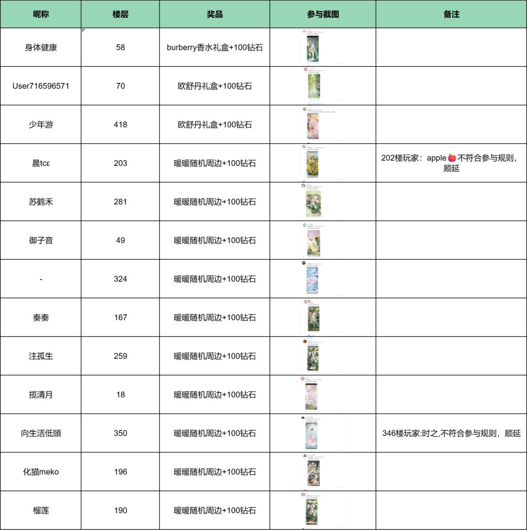 优秀参与奖10位:随机抽取,送出暖暖随机周边+100钻石。