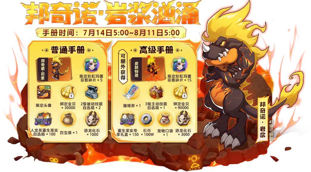 同时,解锁高级手册还能获得【邦奇诺·岩浆】皮肤特效,感受红色熔岩喷薄而出的大招震撼效果。