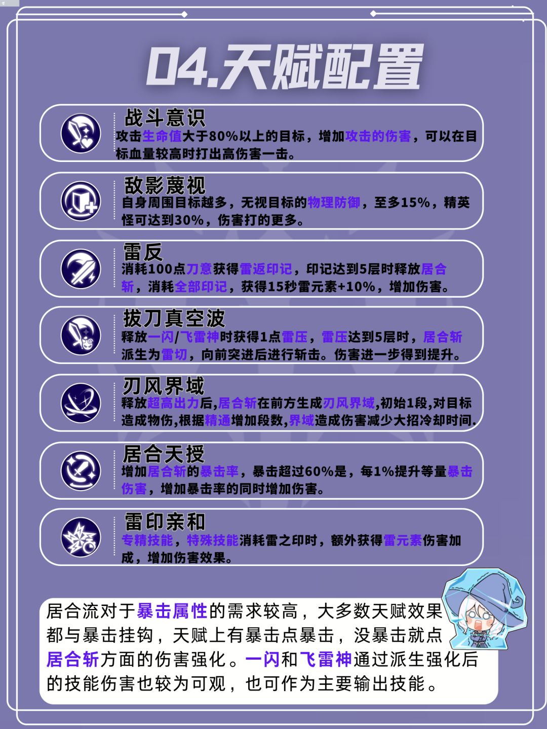 居合流对于暴击属性的需求较高,大多数天赋效果都与暴击挂钩,天赋上有暴击点暴击,没暴击就点居合斩方面的伤害强化。