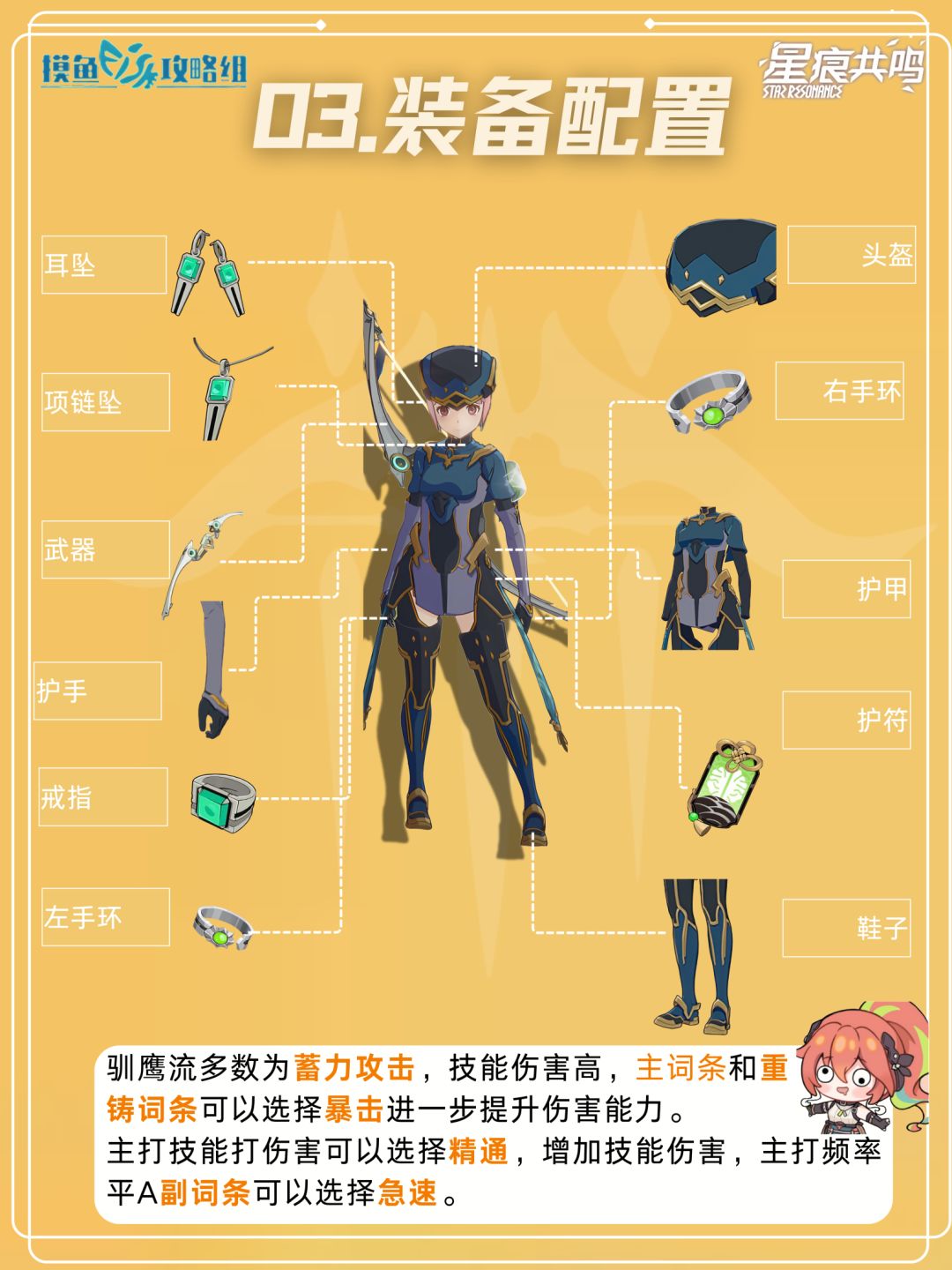 装备词条上需要多选择暴击和精通来打出高伤害,通过猎鹰增加自身攻速,就算是平a请怪效率也很高,驯鹰流也是目标主流的流派。*内容基于星痕共鸣创作体验服制作~