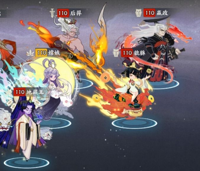 思路:由于小兵会一直反击,加上boss越到后面aoe伤害越疼,所以这里会用到地藏王和嫦娥双治疗的保护,小怪一直反击,嫦娥就会一直回血,从而保证我方的状态,嬴政和貔貅的目的是拉后羿夹击打伤害。