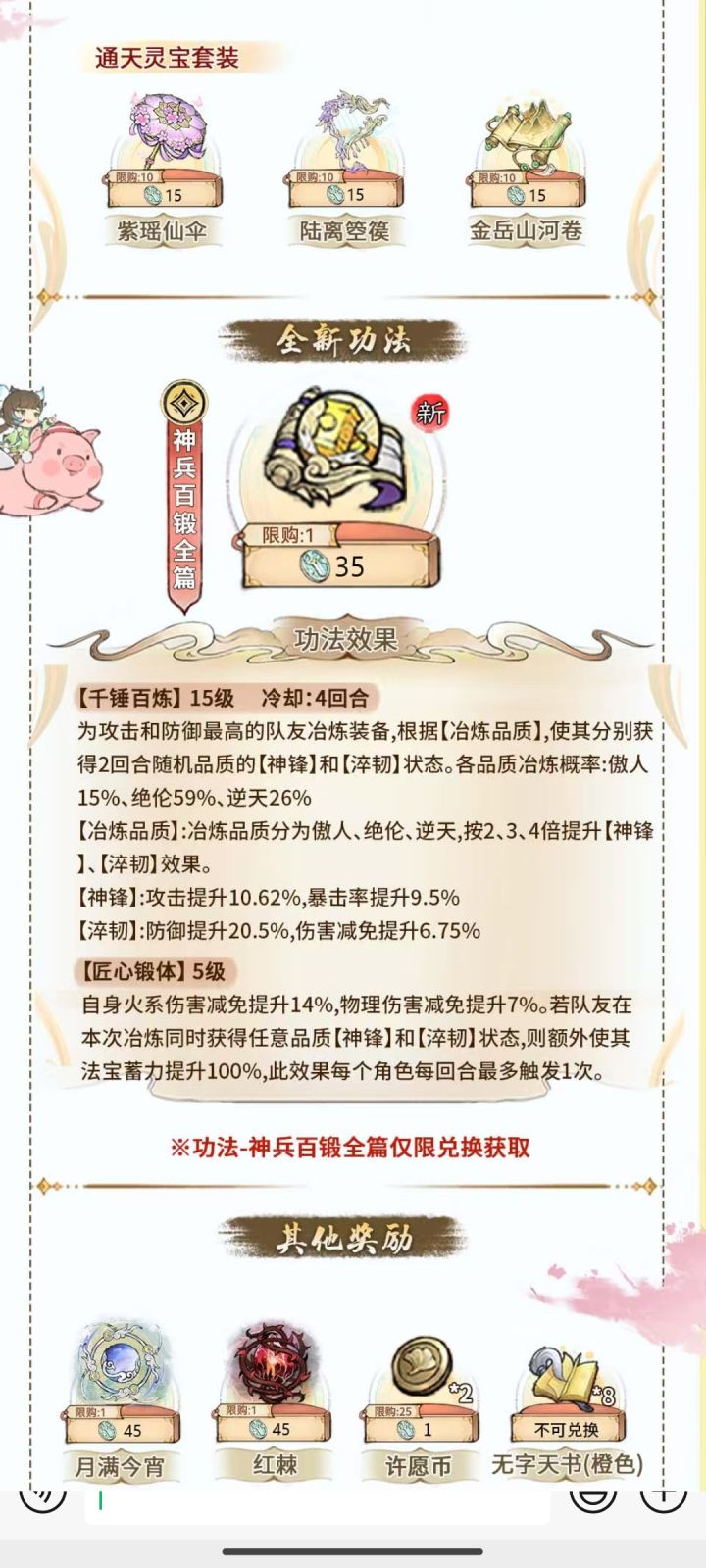 这是本金功法,能贴合猴子体系的就五行蝉,熊猫或者紫霞,没啥装备格子,感觉就是为了拉二阶熊猫特地准备了这本打铁功法。让氪佬的猴子队提了上限。补强猴子体系,但是记住了我们如果是平民低氪,做不到花米填充时间成本,就老老实实囤够700抽先拿免费的再动,这本打铁功法可以留着以后返场。对平民来说成本太大了,不要硬拿。