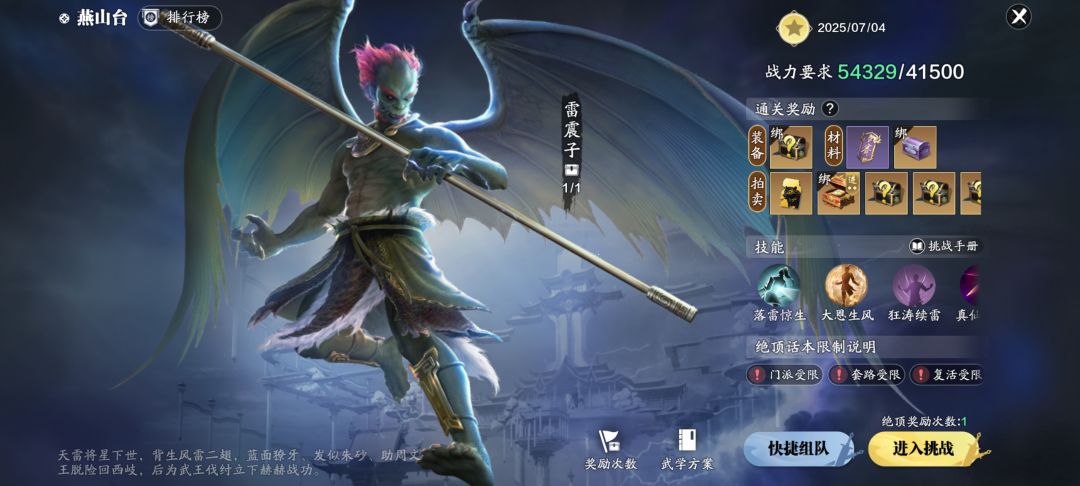第一阶段雷震子只会释放“朔风破戎、风抚狂怀、雷霆际会”等攻击技能的组合技,各位少侠需要灵活走位躲避,尽量减少药品消耗,更不能出现减员!