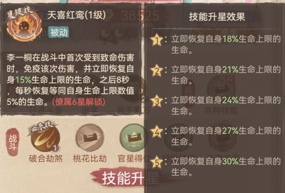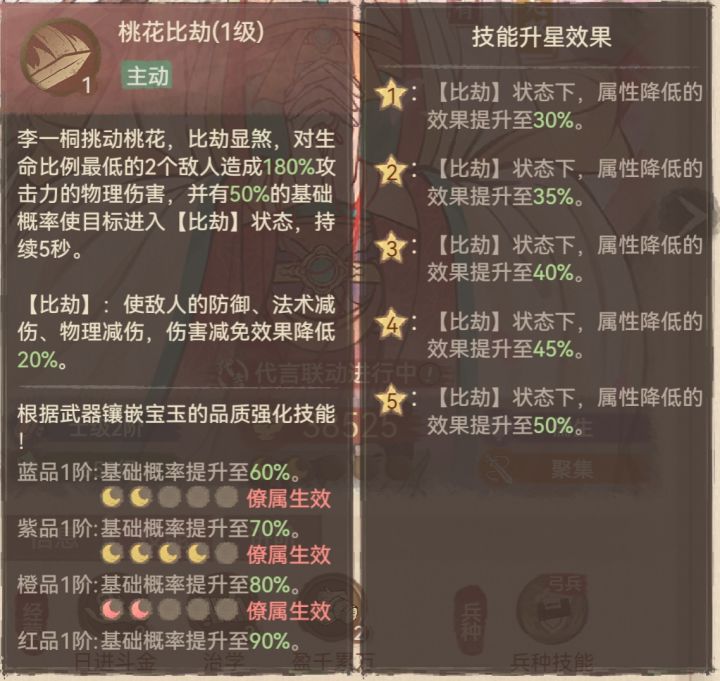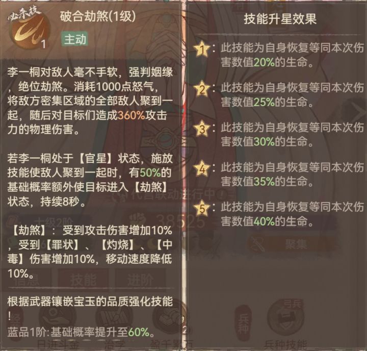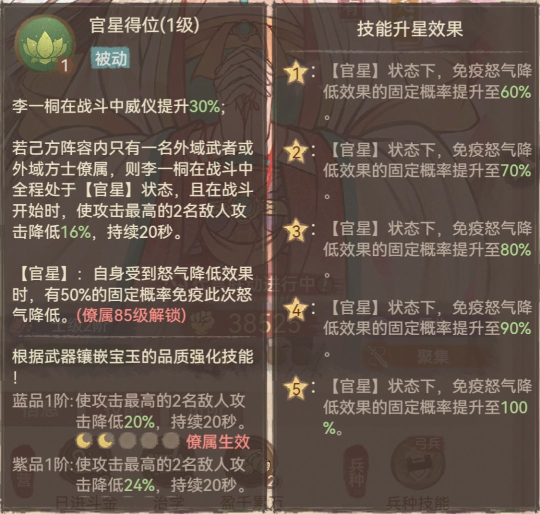【官星】:自身受到怒气降低效果时,有固定概率免疫此次怒气降低,技能5星可百分百免疫力。