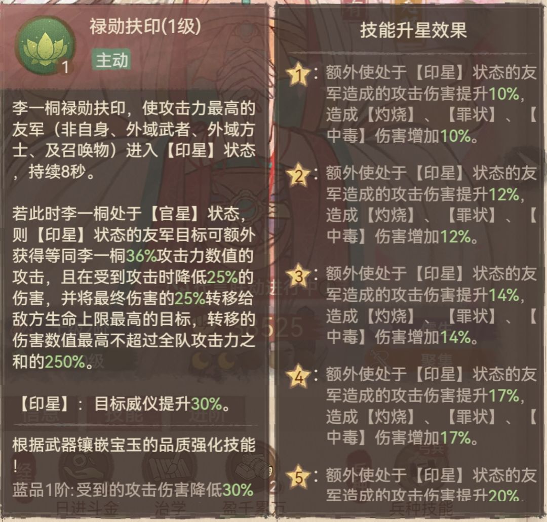 星级技能:提升【印星】状态友军的攻击伤害和【灼烧】、【罪状】、【中毒】的伤害