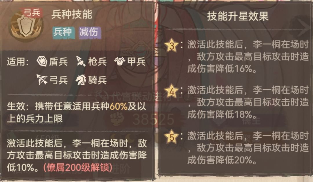 战斗中威仪提升30%:队伍里只能存在李一桐一个外域武者或者外域方士(不能与吕布、宁姚同时登场。),则李一桐在战斗中全程处于【官星】状态,在战斗开始时,使敌方攻击最高的2名寮属攻击降低16%。