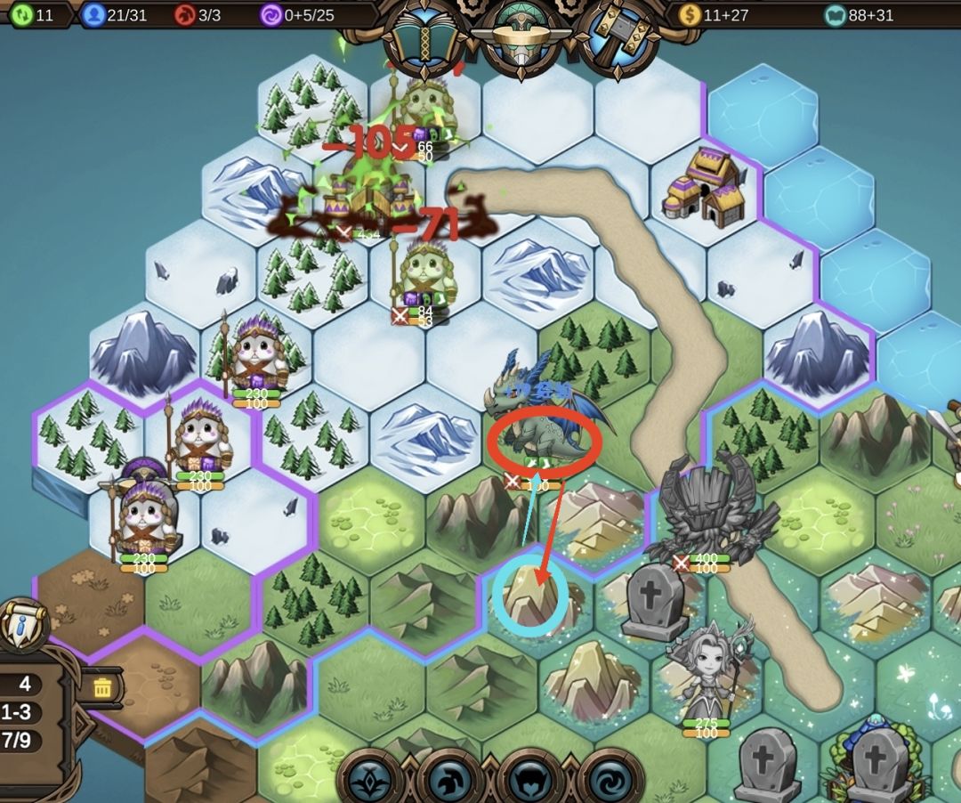 2、例如4格移动力的翡翠龙,从躲藏点出发到进攻点消耗两点移动力,在进攻点A两下敌人城堡(精灵女王给的攻击次数)
