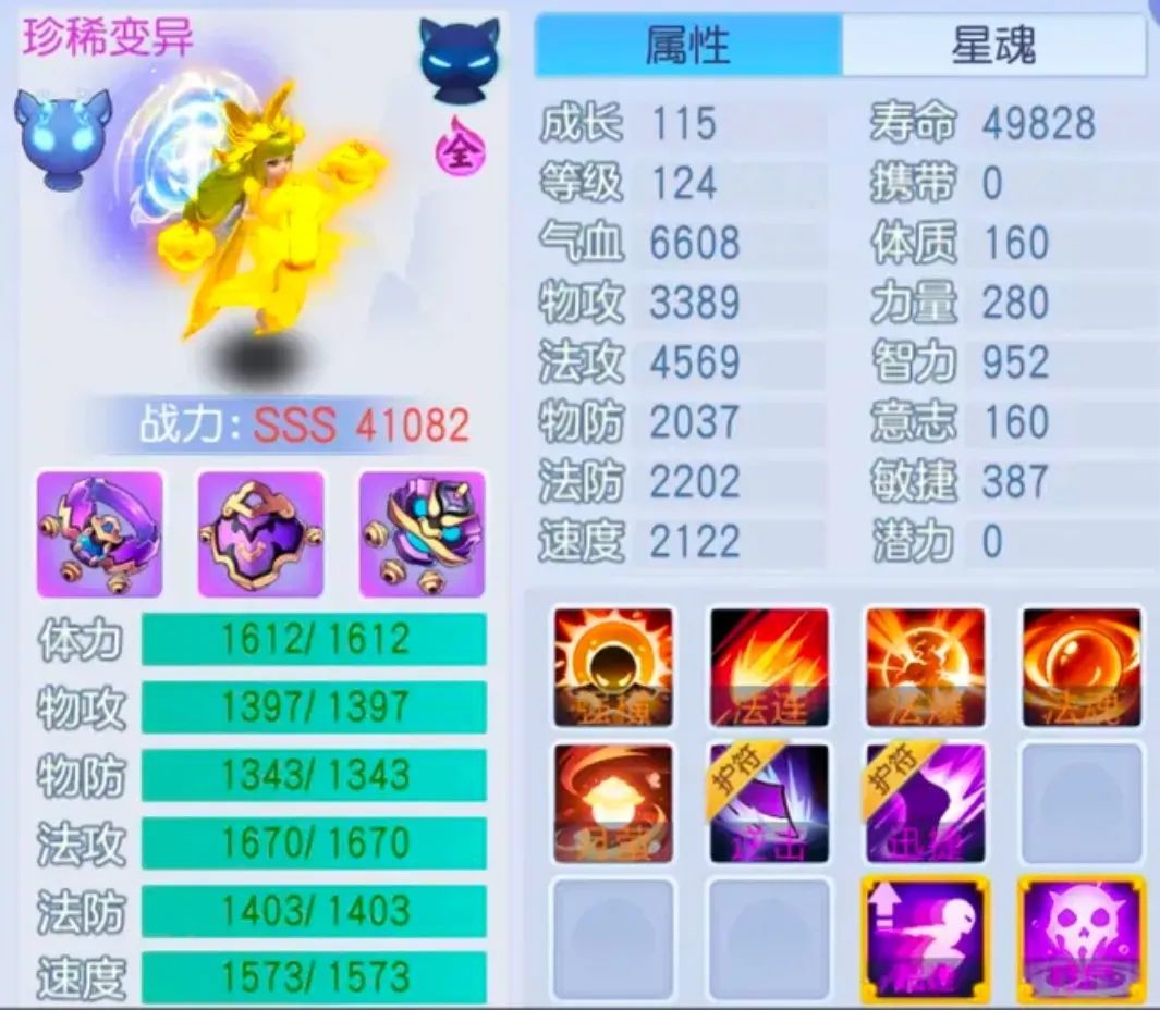 宠物资质成长值115全满,体力、法攻、速度资质全满,双防稍弱,但对输出宠物影响不大,整体资质出色。