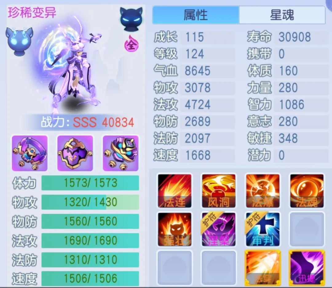 宠物技能月萤 + 超级强横 + 超级法连 + 超级法爆 + 超级法魂 + 高级超速 + 高级行尸 + 护符(高级逆击 + 高级迅捷)技能以输出为主,速度为辅,但缺少超级法穿,建议调整为超级法穿以增强输出。
