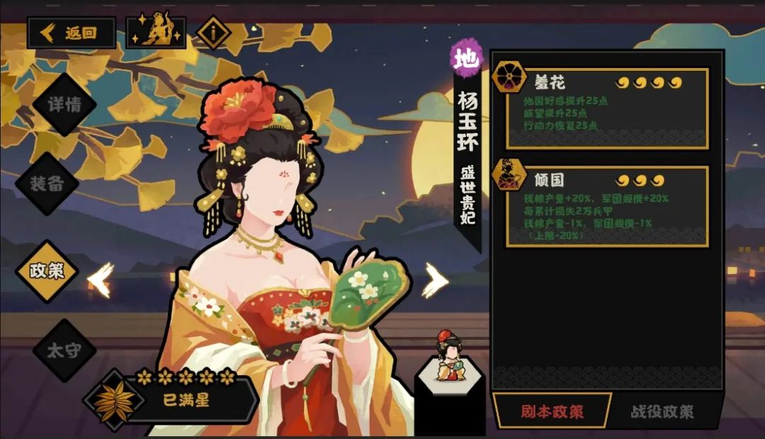 比较全能的政策,能够提供好感、威望、行动力三个都比较有用的属性~
